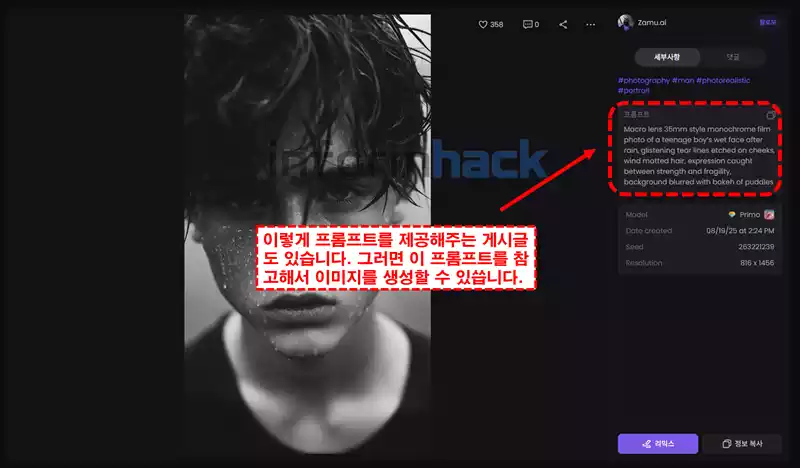 아래 그림과 같이 프롬프트를 공개해준 게시물은 어떻게 생성했는지 프롬프트를 확인할 수 있습니다. 생성할 때 어떤 설정 값을 이용햇는지 확인할 수 있습니다. 생성 결과물과 프롬프트를 확인해서 어떻게 프롬프트를 설정하면 되는지 확인할 수 있습니다.